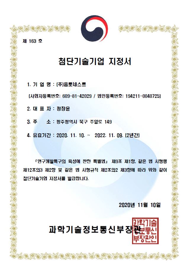 High-tech enterprise 페이지 정보 Name 관리자 Date20-11-24 16:32 Hit7,348 Link Prev Next List 본문 OptoNest Co., Ltd. was designated as high-tech enterprise. Prev Next List