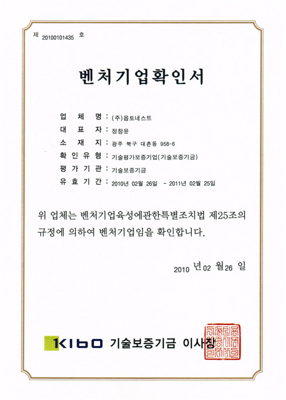 인증 | 벤처기업확인서 페이지 정보 작성자 관리자 작성일10-10-15 09:20 조회19,054회 댓글0건 관련링크 이전글 다음글 목록 본문 벤처기업확인서 댓글목록 등록된 댓글이 없습니다. 이전글 다음글 목록