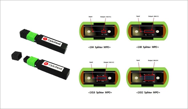 옵토네스트의 MPO Splitter는 고밀도 MPO Connector를 이용하여 제작되어, 입력된 광신호를 여러 포트로 분리하여 전달하는 Optical Splitter의 기능을 아주 적은 사이즈로 구현되었습니다. MPO connector의 장점을 활용한 옵토네스트의 MPO Splitter는 사용자의 시간 및 사용공간의 부피를 획기적으로 줄일 수 있으며, 다양한 Fan-out 및 Cable에 적용될 수 있어 재고 및 유지관리 비용의 절감을 이룰 수 있습니다.